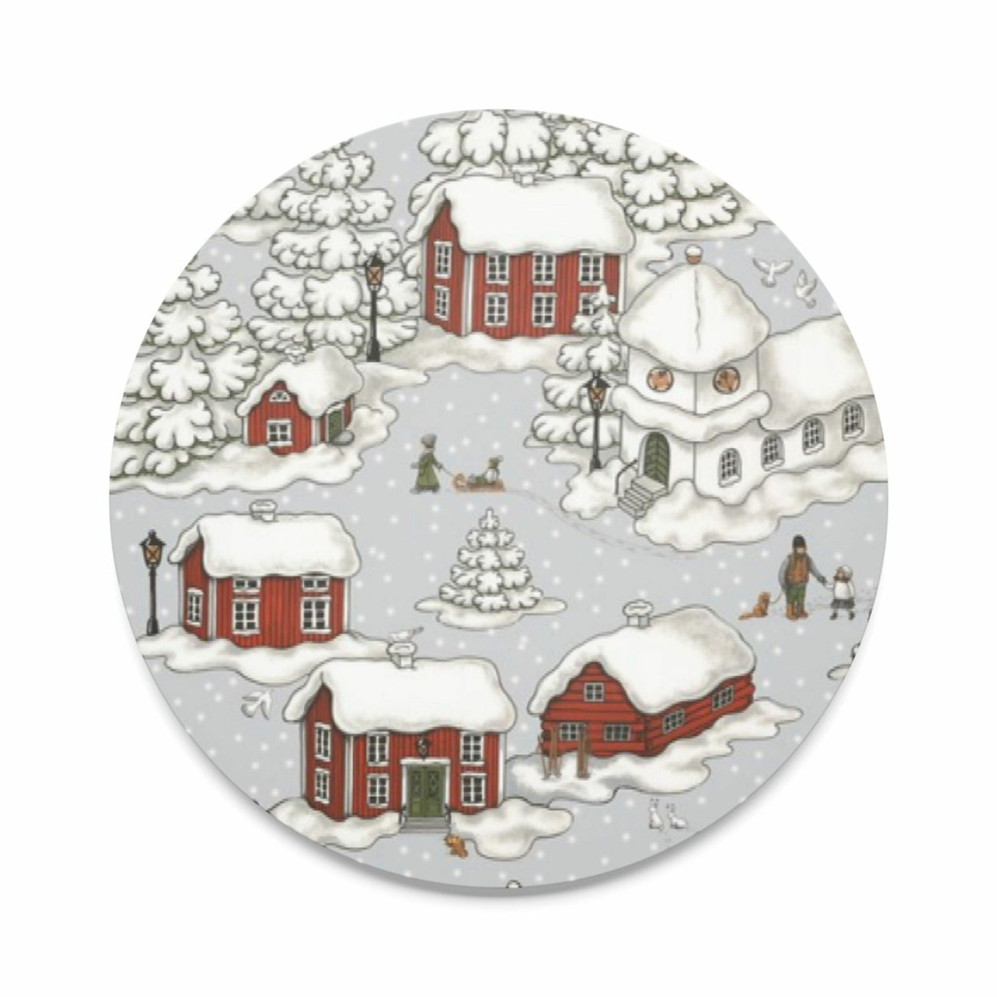 Upplev den nostalgiska charmen med Timmerbyn grå runt grytunderlägg från Arvidssons Textil. Designad av MiaLotta Arvidsson-Mars, detta grytunderlägg är en hyllning till de vackra 1900-talsbyarna med sina timrade hus och snötäckta landskap.