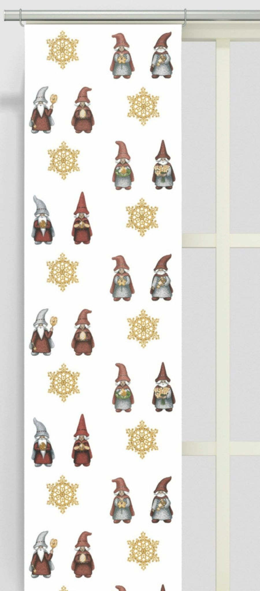 Tomtepar offwhite/röd panellängd 2-pack från Arvidssons Textil är en mjuk panel i bomull med julmotiv. Den ljusa offwhite basen kombineras med röda tomtefigurer och gyllene snöstjärnor för en klassisk, lantlig julstil som passar i kök, vardagsrum eller barnrum. Panelerna är enkla att montera på vanlig gardinstång och ger ett varmt, ombonat ljus samtidigt som de skyddar mot insyn.