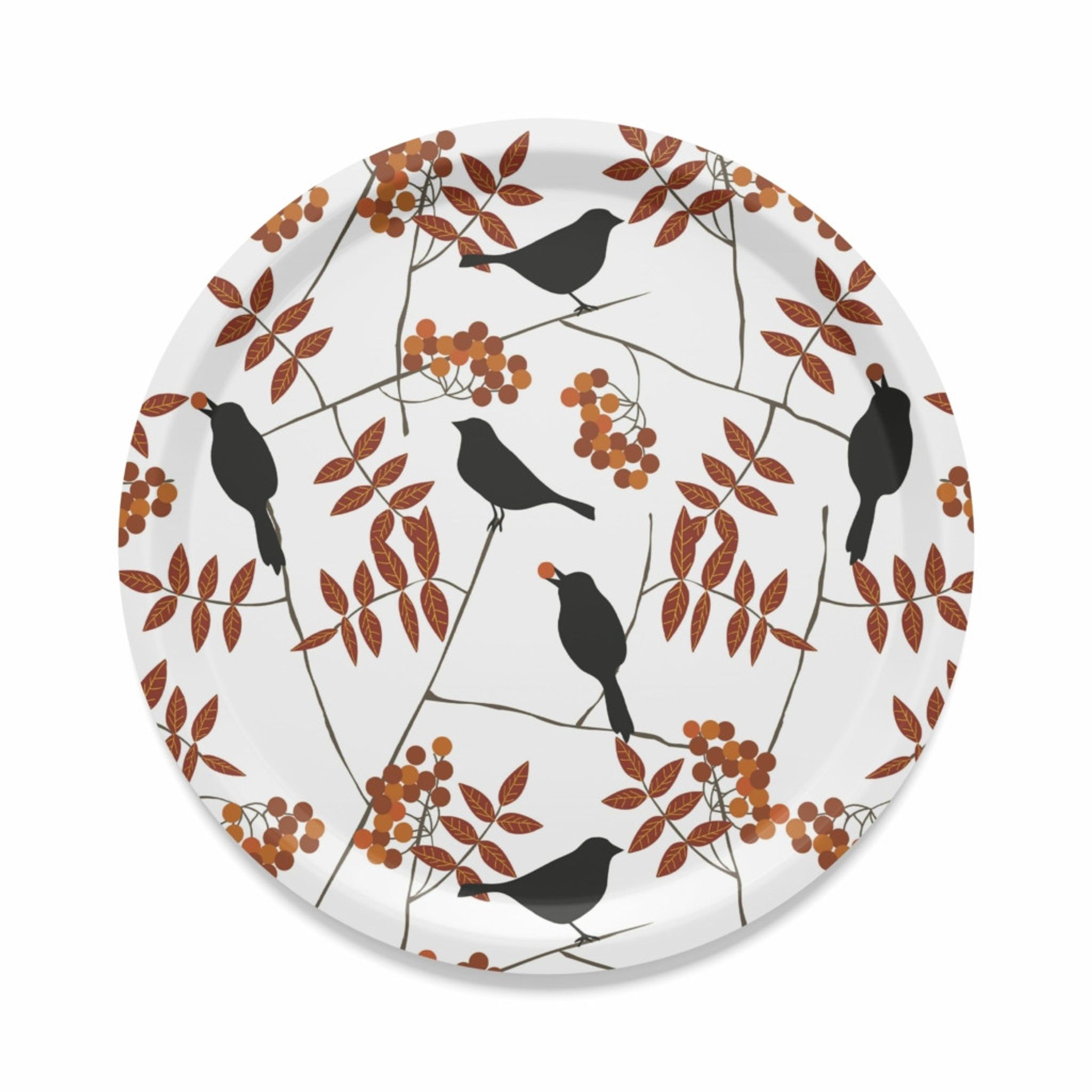 Trast I Hast rost rund bricka från Arvidssons Textil i björkfanér. Designad av Linda Svensson Edevint med ett rostfärgat mönster av fåglar bland grenar – en nordisk detalj som lyfter bordet eller väggdekoren.