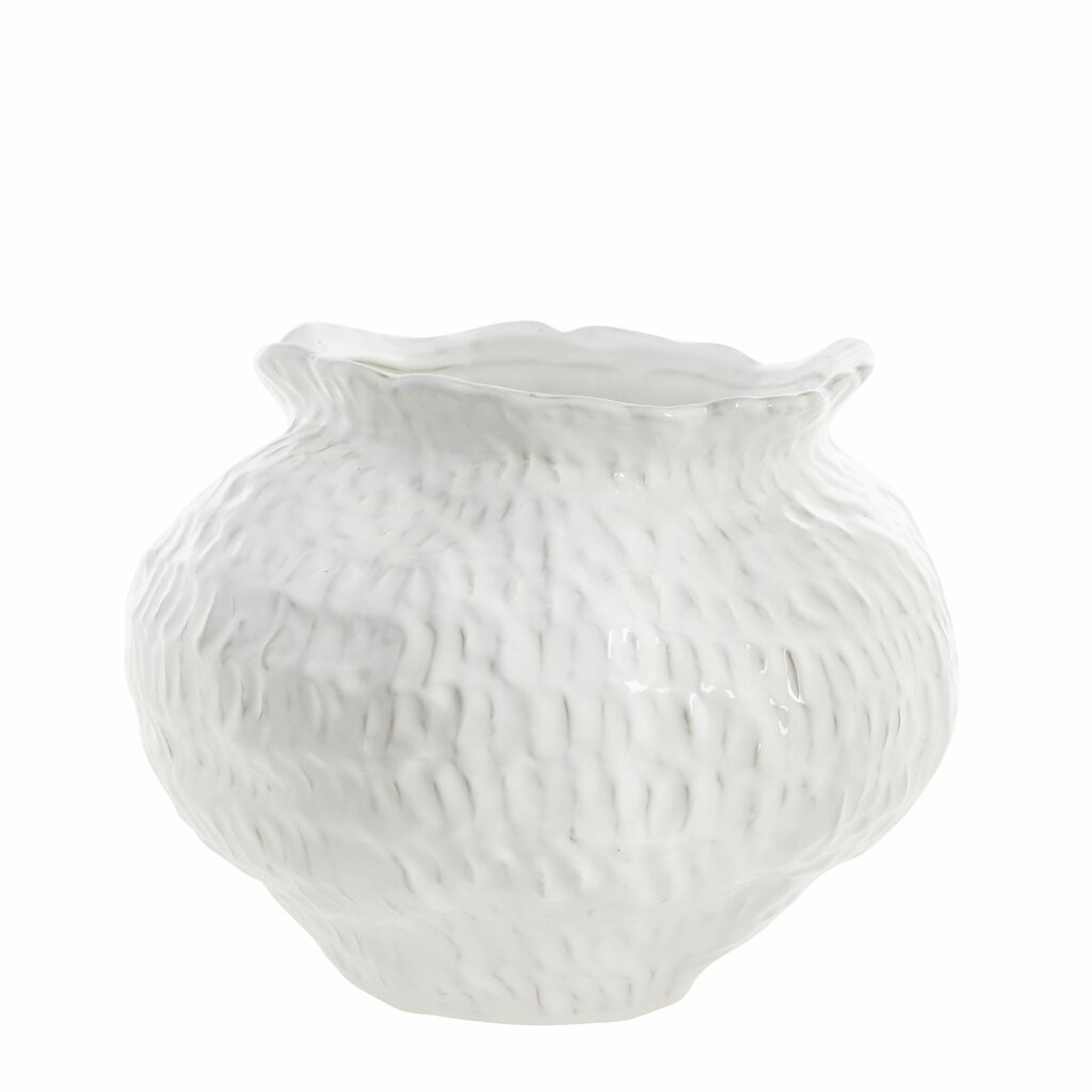 Marlia vas i vit keramik, H 31 cm och Ø 39,5 cm från Lene Bjerre. Den passar på ditt bord eller i hallen, funkar bra för snittblommor eller som snygg, praktisk dekoration som håller länge.