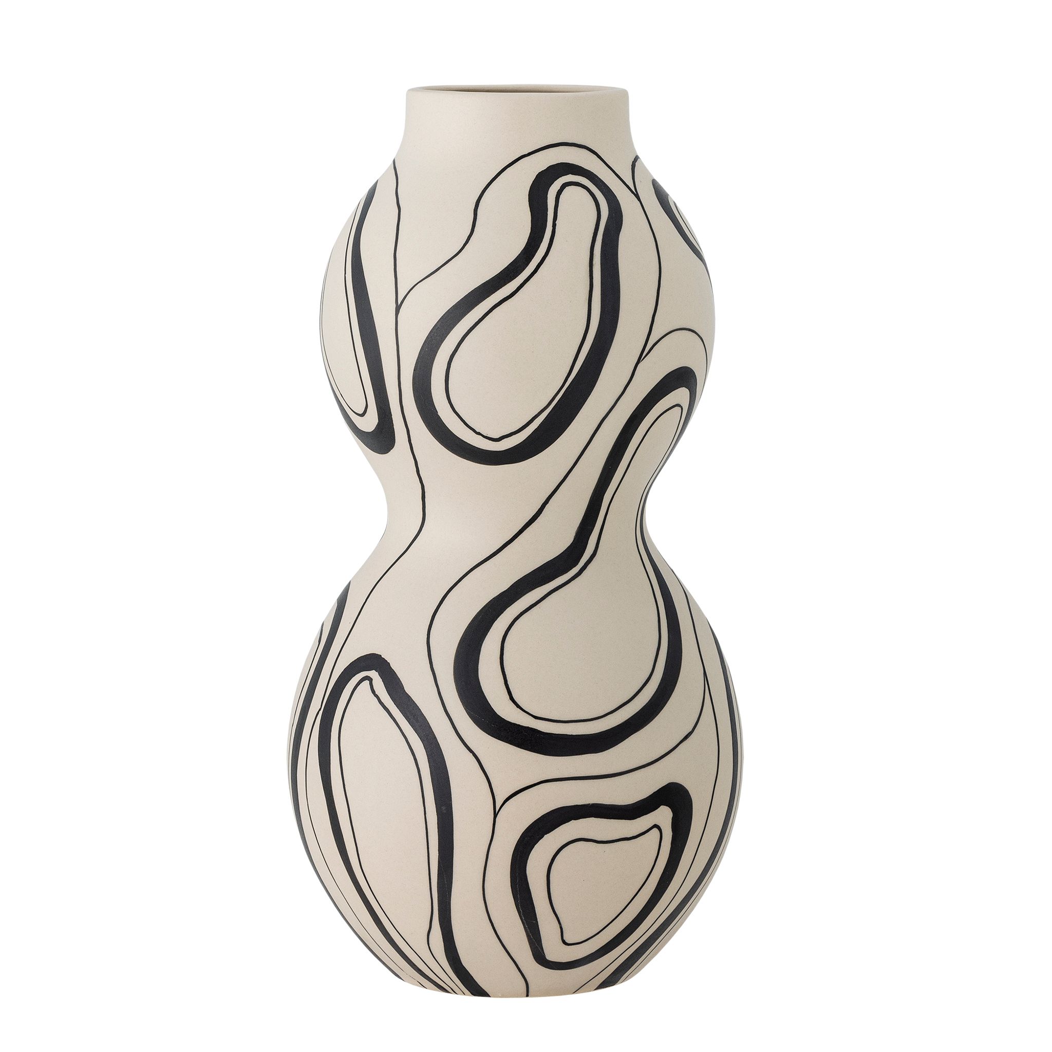 Ge din inredning ett lugnt fokus med Bloomingville Nicola-vasen i svart stengods. Det tryckta dekor-mönstret och den silkeslena glasyren ger en tydlig kontrast mot den neutrala botten och gör vasen till ett fint blickfång på matbordet, fönsterbrädan eller i vardagsrummet.